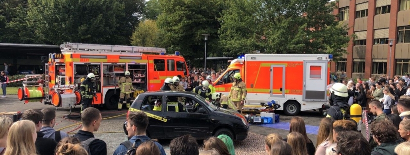 Alle Schüler des Berufskolleg Schloß Neuhaus durften an dem Sicherheitstag teilnehmen. Absolutes Highlight war die erstmals aufgestellte Gafferbox. In dem 3x3m großen und 2,5m hohen Raum sollten die jungen Menschen in die Rolle eines Gafferopfers versetzt werden. Auch andere Stationen sensibilisierten die Schüler für ein richtiges Verhalten im Straßenverkehr. Die Polizei Paderborn präsentierte zum Beispiel ein Crash-Fahrzeug nach einem Unfall. Die Feuerwehr Paderborn organisierte die perfekte Rettungsgasse und an einer anderen Station konnten die Schüler mit einer Art Rauschbrille erfahren wie gefährlich es ist, mit Alkohol oder Drogen im Blut Auto zu fahren.