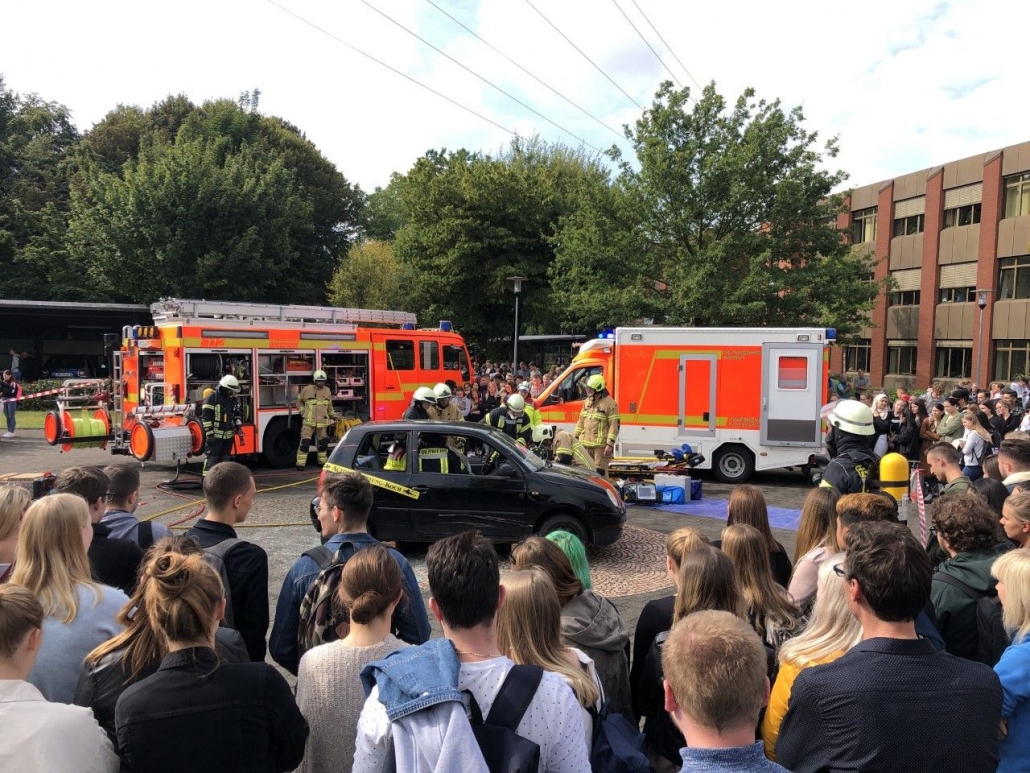 Alle Schüler des Berufskolleg Schloß Neuhaus durften an dem Sicherheitstag teilnehmen. Absolutes Highlight war die erstmals aufgestellte Gafferbox. In dem 3x3m großen und 2,5m hohen Raum sollten die jungen Menschen in die Rolle eines Gafferopfers versetzt werden. Auch andere Stationen sensibilisierten die Schüler für ein richtiges Verhalten im Straßenverkehr. Die Polizei Paderborn präsentierte zum Beispiel ein Crash-Fahrzeug nach einem Unfall. Die Feuerwehr Paderborn organisierte die perfekte Rettungsgasse und an einer anderen Station konnten die Schüler mit einer Art Rauschbrille erfahren wie gefährlich es ist, mit Alkohol oder Drogen im Blut Auto zu fahren.