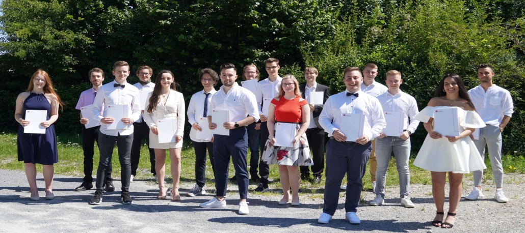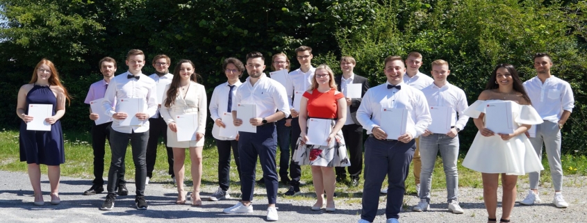 Über die allgemeine Hochschulreife und die dadurch erworbenen sehr guten beruflichen Perspektiven freuen sich (v. l. n. r.): Lisa Marie Grenner, Mika Bröker, Daniel Zerr, Phillip Löwen, Laura Hodza, David Todorov, Mark Renz, Timo Nottrott, Matthias Meyer, Janina Brunnert, Erwin Frei, Daniel Minardi, Davon Maurer, Felix Diestelhorst, Hanna Cicek und Afrem Cakir