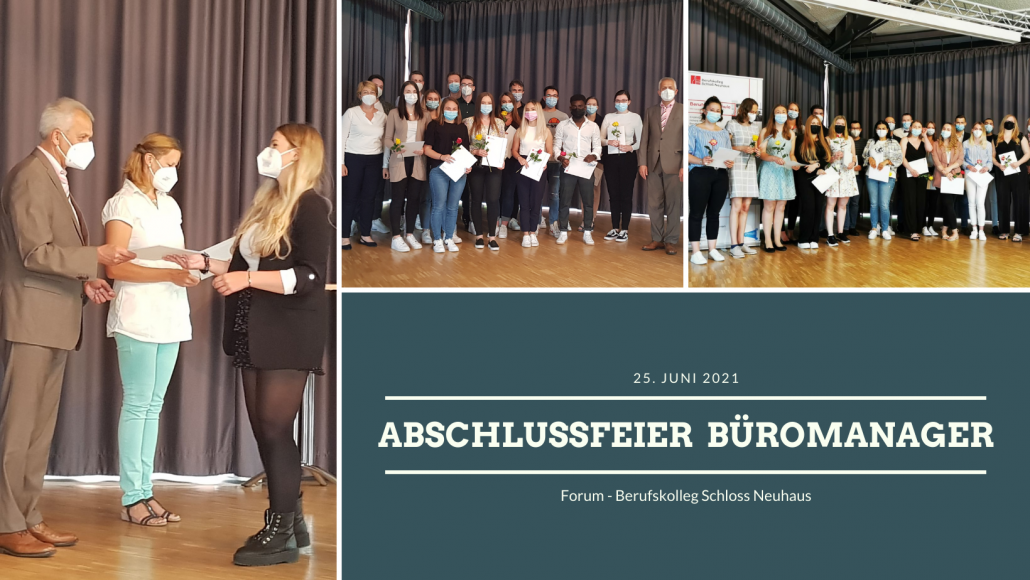 Gestern haben unsere „Büromanager“ im Forum Ihre Abschlusszeugnisse erhalten. In einem würdigen Rahmen gab es nicht nur von unserem Schulleiter Matthias Groß eine in Anlehnen an die aktuelle Fußball-Europameisterschaft gestaltete Rede, sondern auch tolle musikalische Begleitung von BKSN-Schüler „Ryan“ Asgarpouremamchae.