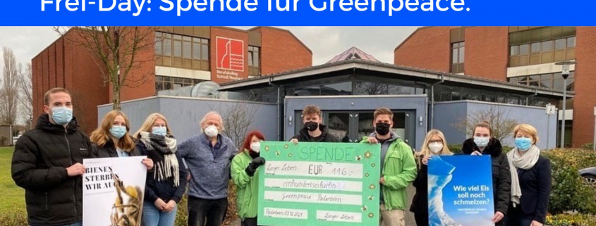 Schülerinnen und Schüler aus der Klasse BK19c haben im Rahmen des FREI-DAYS in Begleitung von Hr. Eilinghoff eine Spendenaktion ins Leben gerufen. Dazu wurden verschiedene Plakate zum Thema Umwelt-, Tier- und Klimaschutz erstellt und im Schulgebäude aufgehängt.