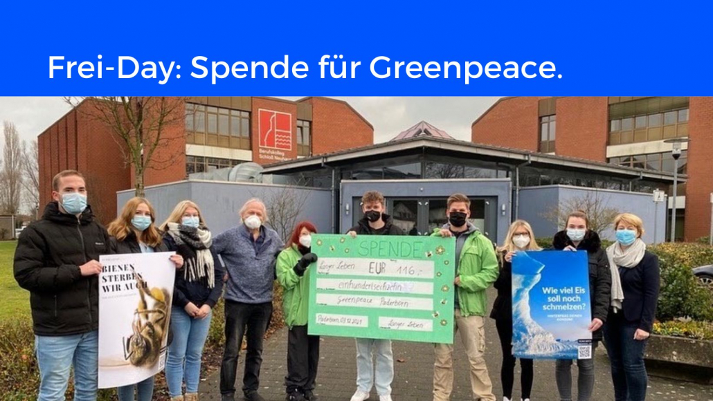 Schülerinnen und Schüler aus der Klasse BK19c haben im Rahmen des FREI-DAYS in Begleitung von Hr. Eilinghoff eine Spendenaktion ins Leben gerufen. Dazu wurden verschiedene Plakate zum Thema Umwelt-, Tier- und Klimaschutz erstellt und im Schulgebäude aufgehängt.