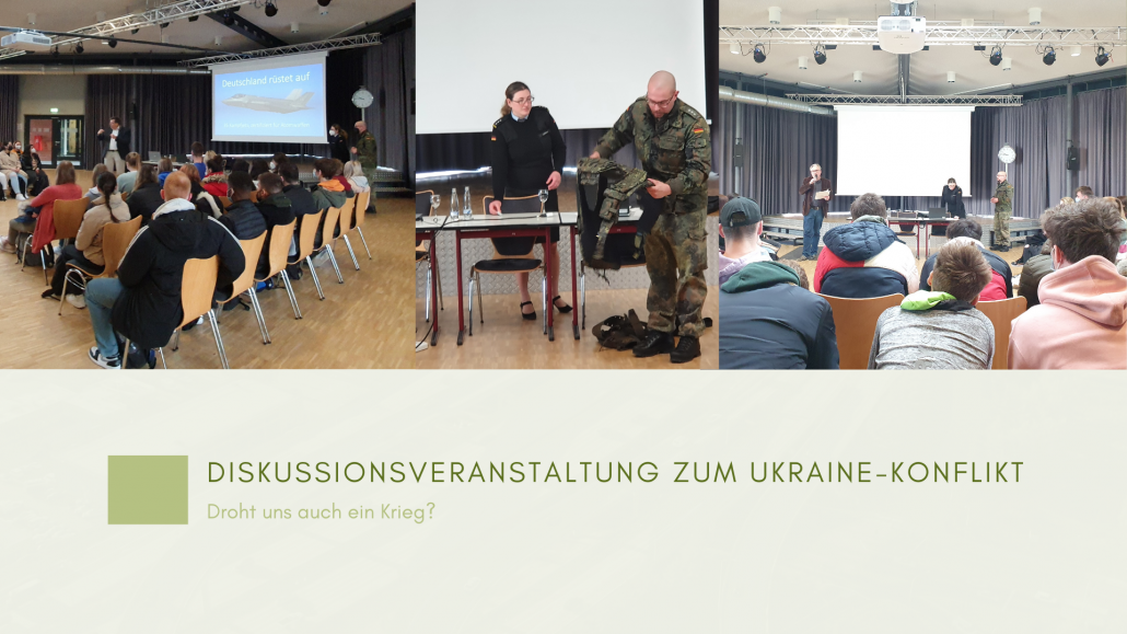 Hauptmann Lena Lehmann und Ihr Offiziers-Gatte waren zu Gast und standen den anwesenden SuS Rede und Antwort zum Ukraine-Konflikt und der damit zusammenhängenden Zeitenwende.