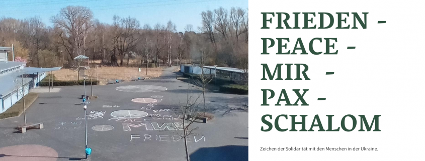 Um ein Zeichen der Solidarität mit den Menschen in der Ukraine zu setzen, haben Schülerinnen und Schüler des Religionskurses der HF21a heute das Peace-Zeichen mehrfach mit bunter Kreide auf den Schulhof des BKSN gemalt. Dazu schrieben Sie großformatig das Wort „Frieden“ in unterschiedlichsten Sprachen: Ukrainisch, Japanisch, Englisch, Russisch, Hebräisch, Aramäisch, Tamilisch, Lateinisch, Deutsch und Französisch. Sie bekunden damit zugleich ihre Solidarität mit allen Geflüchteten aus Kriegs- und Krisengebieten, die zu uns nach Deutschland kommen.