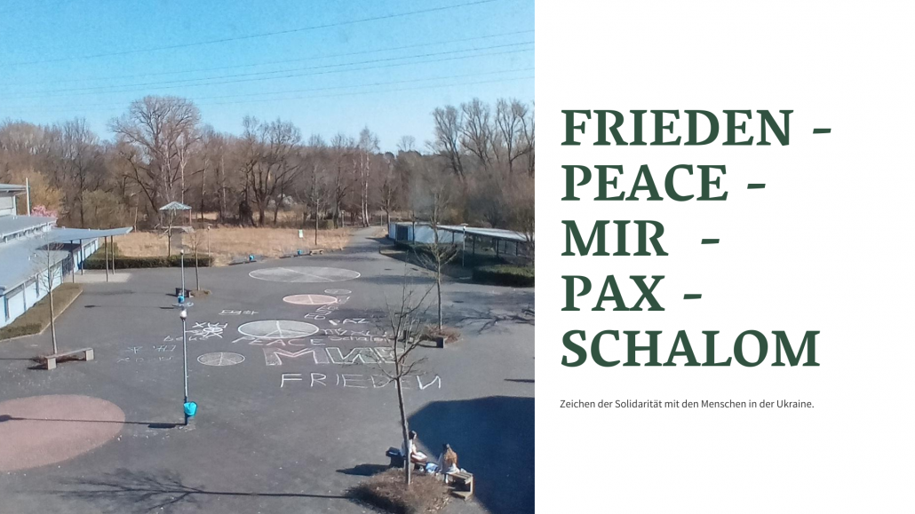 Um ein Zeichen der Solidarität mit den Menschen in der Ukraine zu setzen, haben Schülerinnen und Schüler des Religionskurses der HF21a heute das Peace-Zeichen mehrfach mit bunter Kreide auf den Schulhof des BKSN gemalt. Dazu schrieben Sie großformatig das Wort „Frieden“ in unterschiedlichsten Sprachen: Ukrainisch, Japanisch, Englisch, Russisch, Hebräisch, Aramäisch, Tamilisch, Lateinisch, Deutsch und Französisch. Sie bekunden damit zugleich ihre Solidarität mit allen Geflüchteten aus Kriegs- und Krisengebieten, die zu uns nach Deutschland kommen.