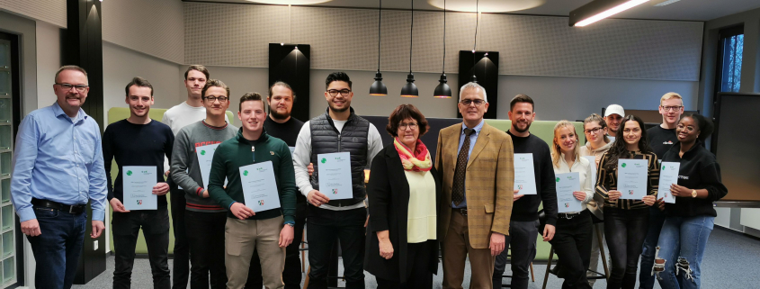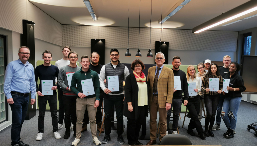 13 Auszubildende von den Bankkaufleuten erhielten unmittelbar vor den Ferien in einer kleinen Feierstunde ihre KMK-Fremdsprachenzertifikate über ihre bankenspezifischen Englischkenntnisse. Ergebnis der schriftlichen Prüfung: durchschnittlich 84 von 100 möglichen Punkten, mündlich: durchschnittlich 28 von 30. Starke Zahlen, tolle Ergebnisse. Wir freuen uns über die Leistungen unserer Schüler/-innen und gratulieren zum zusätzlichen Zertifikat.