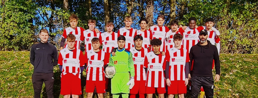 Auf der altehrwürdigen Paderkampfbahn im Herzen Paderborns lagen unsere Kicker zwar gegen das benachbarte Ludwig-Erhard-Berufskolleg früh mit 0:1 zurück, steigerten sich aber minütlich und gingen nach starken Spielzügen und durch Tore von 2x Chukwuemeka und 1x Babak mit 3:1 in Führung und brachten durch herausragende Lauf- und Kampfbereitschaft das tolle Ergebnis über die Runden.
