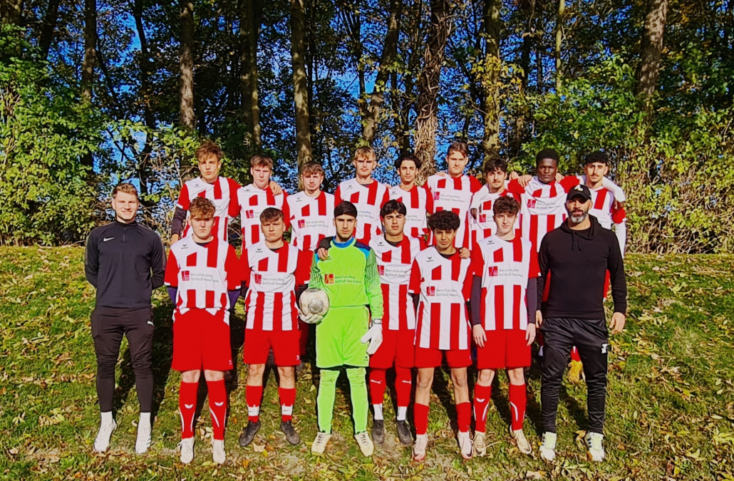 Auf der altehrwürdigen Paderkampfbahn im Herzen Paderborns lagen unsere Kicker zwar gegen das benachbarte Ludwig-Erhard-Berufskolleg früh mit 0:1 zurück, steigerten sich aber minütlich und gingen nach starken Spielzügen und durch Tore von 2x Chukwuemeka und 1x Babak mit 3:1 in Führung und brachten durch herausragende Lauf- und Kampfbereitschaft das tolle Ergebnis über die Runden.