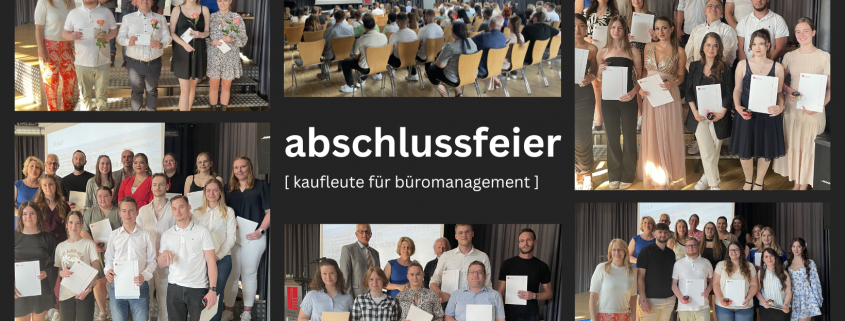 Diese Woche fand die Abschlussfeier der Kaufleute für Büromanagement statt. Organisiert von den vier Klassenlehrern der Oberstufe (Frau Goder, Herr Steffen, Herr Cirrincione und Herr Eilinghoff) moderierte Herr Cirrincione vor knapp 100 Gästen humorvoll durch das kurzweilige Programm und fand immer wieder passende Berufsbezüge in Verbindung zur aktuellen Fußball-Europameisterschaft. Diese bildeten auch Schwerpunkte in den Reden des Schulleiters (Matthias Groß) sowie der Bildungsgangleiterin (Tanja Groddeck), die beide u.a. ein funktionierendes Team als wichtigen Bestandteil beruflichen Erfolgs herausstellten. Pianist Eduard Gildenberger gab zwischendurch Klavierstücke zum Besten und überraschte mit einer gelungenen eigenen Komposition. Nachdem die Zeugnisse überreicht und die vier besten SuS für ihre überragenden Leistungen zusätzlich prämiert wurden, konnten die glücklichen Absolventen noch ein paar Erinnerungsfotos schießen und mit einem Kaltgetränk auf das Geschaffte anstoßen.