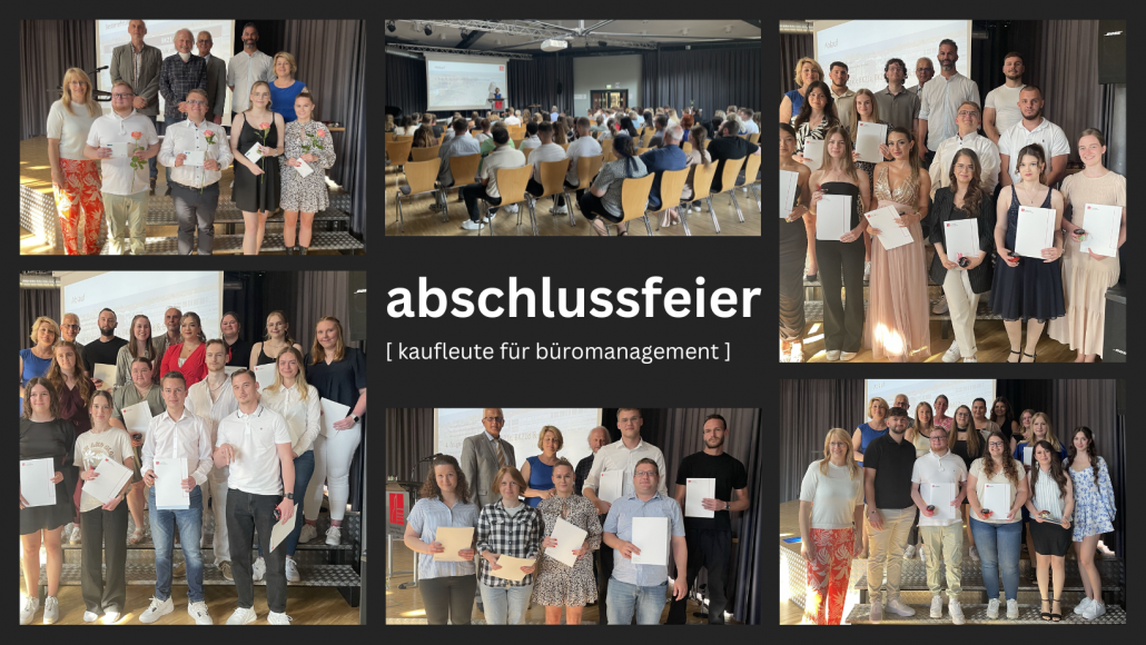 Diese Woche fand die Abschlussfeier der Kaufleute für Büromanagement statt. Organisiert von den vier Klassenlehrern der Oberstufe (Frau Goder, Herr Steffen, Herr Cirrincione und Herr Eilinghoff) moderierte Herr Cirrincione vor knapp 100 Gästen humorvoll durch das kurzweilige Programm und fand immer wieder passende Berufsbezüge in Verbindung zur aktuellen Fußball-Europameisterschaft. Diese bildeten auch Schwerpunkte in den Reden des Schulleiters (Matthias Groß) sowie der Bildungsgangleiterin (Tanja Groddeck), die beide u.a. ein funktionierendes Team als wichtigen Bestandteil beruflichen Erfolgs herausstellten. Pianist Eduard Gildenberger gab zwischendurch Klavierstücke zum Besten und überraschte mit einer gelungenen eigenen Komposition. Nachdem die Zeugnisse überreicht und die vier besten SuS für ihre überragenden Leistungen zusätzlich prämiert wurden, konnten die glücklichen Absolventen noch ein paar Erinnerungsfotos schießen und mit einem Kaltgetränk auf das Geschaffte anstoßen.