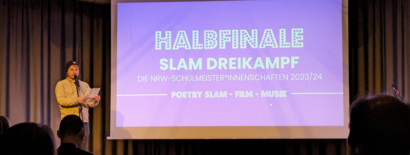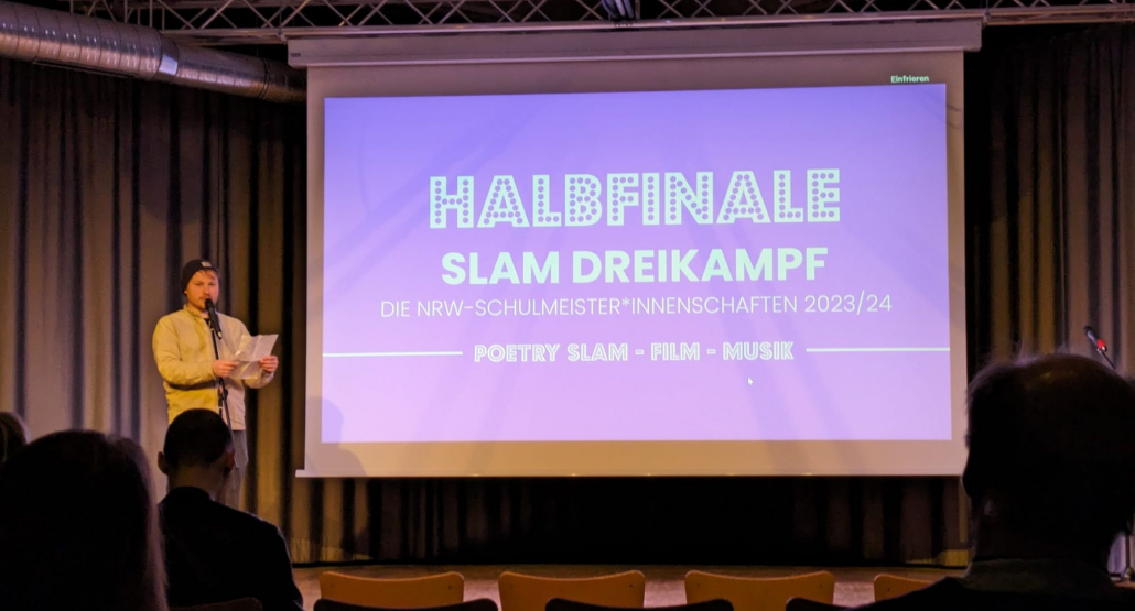 Am letzten Dienstagabend füllten sich die Plätze des Forums, denn das Slam-Dreikampf-Halbfinale OWL stand an. Die Schüler*innen des Gymnasiums St. Michael traten gegen unsere Schüler*innen aus der Internationalen Klasse, der AV und aus der GI an.