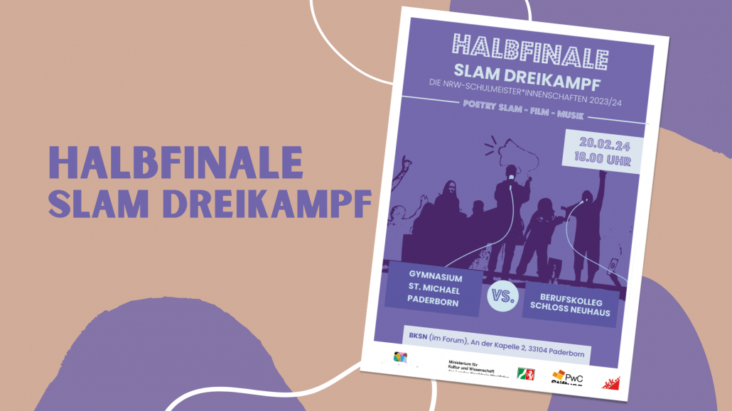 Taucht für einen Moment ein in andere Welten, wenn Schüler*innen unseres Berufskollegs Schloß Neuhaus gegen Schüler*innen des Gymnasiums St. Michael antreten, um sich mit ihnen mit selbst kreierten Texten, Musikstücken und Filmen zu messen. Eine Fachjury entscheidet. Doch Euer Applaus ist der eigentliche Lohn für die mutigen Teams. Ganz im Sinne des übergeordneten Mottos des Slams „Respect the poets“.