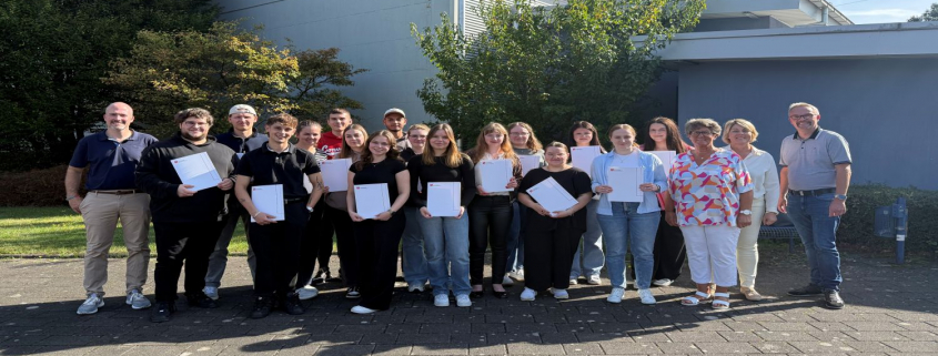 Organisiert wurde das Projekt von Ulrike Heinich, die gemeinsam mit Tanja Groddeck (StD’ in Kaufleute für Büromanagement und Fachschule für Wirtschaft) und Sören Welp (StD Bankkaufleute) die erfolgreichen Absolventinnen und Absolventen zur Übergabe beglückwünschte. Auch Schulleiter Stefan Werth gratulierte und hob die Bedeutung der erworbenen Kompetenzen für die berufliche Zukunft hervor.