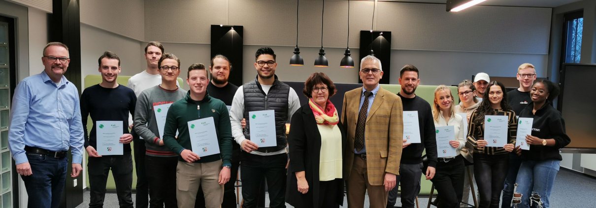 13 Auszubildende von den Bankkaufleuten erhielten unmittelbar vor den Ferien in einer kleinen Feierstunde ihre KMK-Fremdsprachenzertifikate über ihre bankenspezifischen Englischkenntnisse. Ergebnis der schriftlichen Prüfung: durchschnittlich 84 von 100 möglichen Punkten, mündlich: durchschnittlich 28 von 30. Starke Zahlen, tolle Ergebnisse. Wir freuen uns über die Leistungen unserer Schüler/-innen und gratulieren zum zusätzlichen Zertifikat.